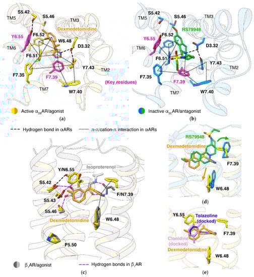 Mechanisms in α2 adrenergic receptors. (a) Agonist recognition (dexmedetomidine in α2BAR, PDB ID: 6K41 [52]). (b) Antagonist recognition (RS 79948 in α2CAR, PDB ID: 6KUW [99]). (c) Comparison of agonist recognition in α2ARs and βARs (isoproterenol in β1AR, PDB ID: 6H7J [54]). (d) Conformational changes in active/inactive α2ARs. (e) Binding poses of agonist clonidine and antagonist torazoline, predicted by molecular docking (Glide program in Schrodinger platform 2019-2 [38]).