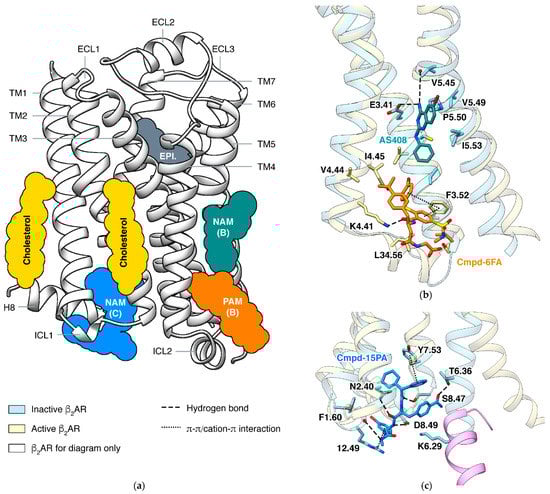 Allosteric modulating of β2AR. (a) Positions of allosteric sites (including cholesterol binding sites) identified in structures. The orthosteric site is marked by endogenous agonist epinephrine (EPI.). Positions of cholesterol are from a crystal structure in an inactive state (PDB ID: 2RH1 [6]). (b) PAM Cmpd-6FA and NAM AS408 in lipid interface at TM3/4/5 (PDB IDs: 6N48 [106] and 6OBA [107]). (c) Cytoplasmic NAM Cmpd-15PA compared to active state β2AR (PDB IDs: 5X7D [109] and 3SN6 [8]).