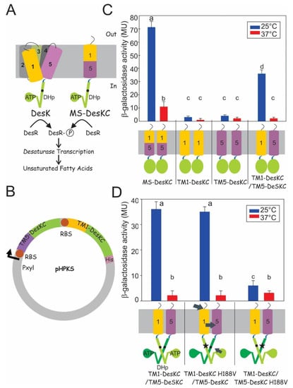 12. Inda, M.E.; Vandenbranden, M.; Fernandez, A.; de Mendoza, D.; Ruysschaert, J.-M.; Cybulski, L.E. A lipid-mediated conformational switch modulates the thermosensing activity of DesK. Proc. Natl. Acad. Sci. USA 2014, 111, 3579–3584. [Google Scholar] [CrossRef] [PubMed] [Green Version]