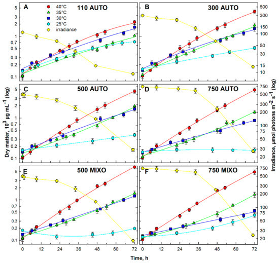 The growth of the Galdieria sulphuraria under auto- (panels (A–D), AUTO) and mixotrophic (panels (E,F), MIXO) regimes at different starting irradiances in the center of the cultivation cylinder (110, 300, 500 and 750 µmol photons m−2 s−1, indicated in each panel) and different temperatures (40 °C-red circles, 35 °C-green triangles, 30 °C-dark blue squares, and 25 °C-cyan hexagons). The irradiance in the center of cultivation cylinders declining with increasing cell density during the cultivation is indicated in each panel (yellow diamonds). Growth is expressed as dry matter (DM) in µg mL−1. The data are plotted as means of biological triplicates. The error bars represent standard deviations (±SD) and are shown when larger than the symbol size.