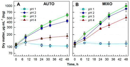To evaluate the effect of pH, the strain was cultivated under continuous light at a starting irradiance of 500 μmol photons m−2 s−1 at 40 °C under different trophic regimes for 48 h (Figure 2). The same initial cell density (dry matter) of about 100 µg mL−1 was applied at the beginning of the experiment to all cultures. The mixotrophic cultures grew with the addition of 1% glycerol. Comparing the autotrophic growth of G. sulphuraria at pH 1, 2, 3 and 4, the best growth (up to DM 600 µg mL−1) was reached at pH 3 (Figure 2A). Similar patterns were obtained under the mixotrophic regime where the culture reached the maximum DM of 1000 µg mL−1 at pH 3 (Figure 2B). Growth under mixotrophic conditions was increased under all pH conditions when compared with the autotrophic cultures. pH 1 was lethal for both cultures (Figure 2; cyan circles). pH 3 was chosen as the optimal one for further experiments.