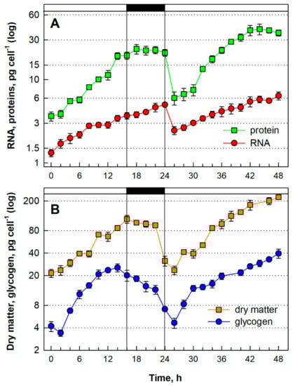 The accumulation of glycogen, the energy reserve of red algae, was followed within the synchronized culture (Figure 3B, blue circles). The net content of glycogen started to increase from the beginning of the cell cycle, reaching a peak (25.5 pg cell−1) at the 14th h. The glycogen content increased by about 6 fold and was consumed during the dark phase to a value of 7.1 pg cell−1 (Figure 3B, blue circles; dark phase indicated by the black bar). After dilution of the culture to the initial concentration, the glycogen pool started to grow again in the next cell cycle, in continuous light, and the cells acquired about 8.5-fold higher levels of glycogen (39.5 pg cell−1) at the end of the cell cycle (Figure 3B, blue circles, 48 h).