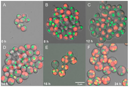 Fluorescent photomicrographs of a synchronous culture of Galdieria sulphuraria grown under optimal conditions (500 µmol photons m−2 s−1, 40 °C, pH 3). Daughter cells ((A) 0 h), growing single cells ((B) 8 h), chloroplast and nuclei starting to divide ((C) 12 h), division into 2 cells ((D) 14 h), division into 4 cells, protoplast division apparent ((E) 16 h), four daughter cells growing inside the original mother cell wall before their release ((F) 24 h). Nuclei in green were stained by SYBR Green I, chloroplasts in red—autofluorescence of chlorophyll. The bar represents 5 µm.