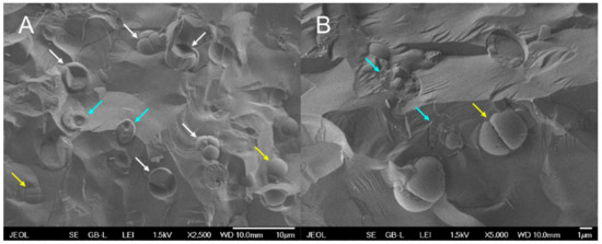 Photomicrographs of the asynchronous culture of Galdieria sulphuraria grown under optimal conditions (500 µmol photons m−2 s−1, 40 °C, pH 3) and visualized using a cryo-scanning electron microscope (cryo-SEM). Single daughter cells-cyan arrows, mother cells divided into 2 daughter cells-yellow arrows, mother cells divided into 4 daughter cells-white arrows (A,B). The bar represents 10 µm in (A) and 1 µm in (B).