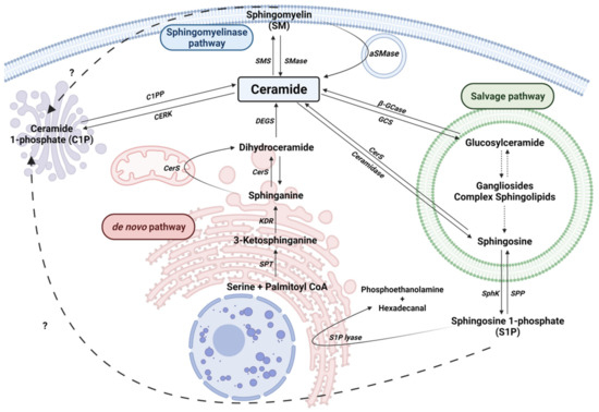 Cers are considered the central hub of sphingolipid metabolism and can regulate key metabolic functions. In particular, Cers are potent inducers of cell cycle arrest and apoptotic cell death [13,24], and are implicated in inflammatory responses related to microbial infection, asthma, cardiovascular diseases or chronic obstructive pulmonary disease (COPD) [25,26]. Moreover, an unbalance of intracellular Cer levels can lead to neurological and neuroinflammatory diseases. Cers are synthesized mainly by three major pathways. Furthermore, Cer can be synthesized by the dephosphorylation of ceramide 1-phosphate (C1P) by ceramide 1-phosphate phosphatase (CPP). In addition to producing Cer, the metabolites of complex sphingolipid catabolism lead to the production of another bioactive molecules, such as sphingosine 1-phosphate (Figure 1).