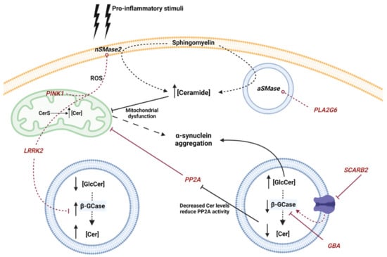 The PINK1 gene encodes for phosphatase and tensin homolog (PTEN)-induced putative kinase protein 1 (PINK1), a mitochondrial-targeted serine/threonine kinase [165]. This protein is implicated in the maintenance of mitochondrial homeostasis. When the mitochondrial membrane suffers a depolarization due to oxidative stress, PINK1 recruits the E3 ubiquitin ligase Parkin protein from the cytosol, initiating a process of mitochondrial degradation called mitophagy [166]. One of the most important consequences is the dysfunction of Na+/Ca2+ exchange regulation [167]. Mutations in the PINK1 gene are the most common cause of recessive familial PD [165]. Gandhi et al. demonstrated that kinase-dead mutant K219M-PINK1 promotes a dysfunction of Na+/Ca2+ exchanger with the consequent accumulation of Ca2+ in the mitochondria [167]. Calcium overload in the mitochondria stimulates NAPDH oxidase and the production of ROS. The disruption of the electron chain also causes a decrease in glucose transporters in the membrane of neurons by decreasing cellular metabolism. Different studies have shown that the accumulation of ROS stimulates the activity of nSMase2 and the production of Cer [168,169]. Interestingly, the elevation of Cer levels can also take place in the mitochondria by the action of ASAH1 and ASAH2. Moreover, Cer was described to stimulate mitophagy by a mechanism that involves the recruitment of the PINK1/Parkin complex to the mitochondrial membrane [170].
