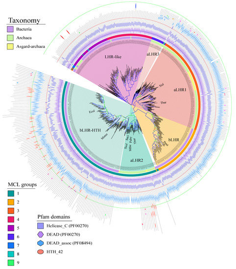 22] was used to annotate proteins with Pfam (32.0) domains. To avoid redundancies due to multiple repetitions of strains of the same species, we retained only one strain per species. Conversely, in order to obtain a better coverage of Archaea’s diversity, 75 Asgard proteomes were retrieved from UniProt, although they do not have the same sequencing and annotation quality as the other archaeal genomes (35 Lokiarchaeota, 27 Thorarchaeota, 12 Heimdallarchaeota and one Odinarchaeota). An initial sample of 1381 Lhr protein candidates were identified using the COG1201 (Lhr-like helicase) annotation performed by