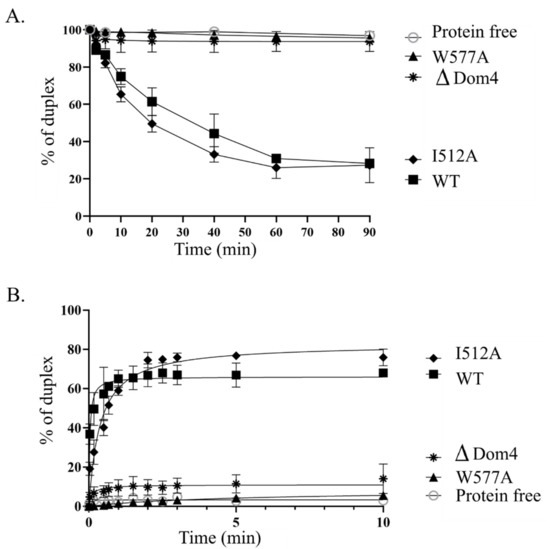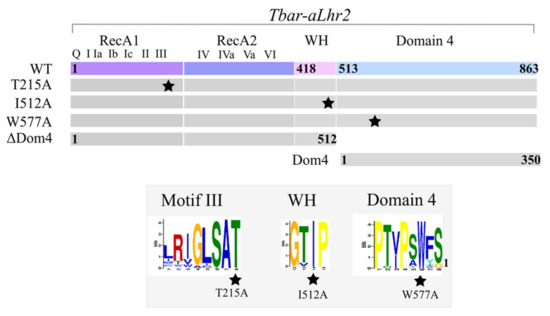 Tbar-aLhr2 annealing and unwinding activities. The substitution of the highly conserved tryptophan at position 577 in