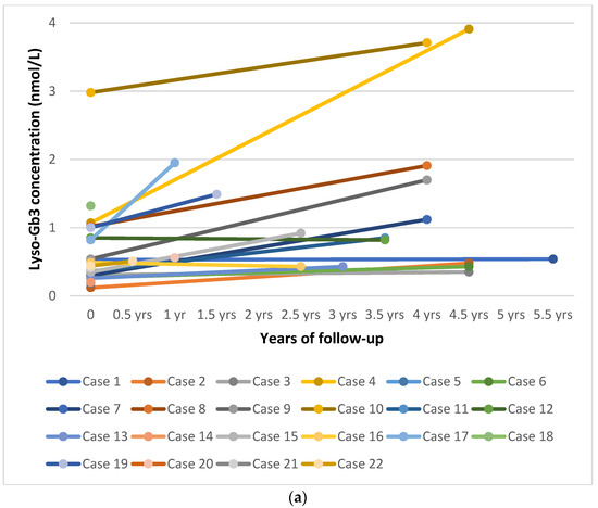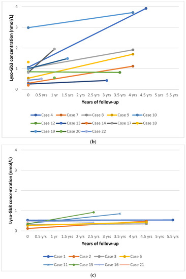 Biomarkers and biochemical follow-up show Lyso-Gb3 (also known as globotriaosylsphingosine) is the N-deacylated form of Gb3 that has been proposed as a specific biomarker for FD [63]. Lyso-Gb3 can be measured in plasma or DBS by LC-MS/MS technology, as we have demonstrated [10]. Recently, we studied lyso-Gb3 in a large cohort of Fabry patients (n = 71) where we observed high levels in males with the classic phenotype and mild-to-moderately elevated levels both in males with the later-onset phenotype and in heterozygous females with the classic phenotype [10]. Storage of Gb3 begins in utero [64,65]; therefore, we evaluated the use of this biomarker as a second-tier test by measuring lyso-Gb3 in DBS from neonates identified by NBS for FD. We found that only five patients, all with a later-onset pathogenic variant, had abnormal DBS lyso-Gb3 at birth, among the 17 tested newborns (of which 12 carrying a pathogenic variant), indicating that a normal result cannot exclude FD and, therefore, cannot be used as a second tier test. At the first visit, plasma lyso-Gb3 was abnormal in 11/21 patients, nine of them with a later-onset variant, one carried the p.Ala143Thr variant, and one had the unclassified p.Leu286Val variant. Interestingly, patient #10 had a very low α-GAL A activity (0.73 µmol/L/h) accompanied by the highest level of plasma lyso-Gb3 that we found in our neonates (2.98 nmol/L). He carries the p.Arg356Gly variant, considered likely associated with a later-onset phenotype. Moreover, we found an inverse linear correlation between DBS lyso-Gb3 /plasma lyso-Gb3 and DBS α-GAL A activity at birth/first visit (r: −0.28 and −0.41, respectively). This finding suggests that lower enzyme activity corresponds to a higher storage from birth. Although a normal DBS lyso-Gb3 value cannot rule out FD, its use as a specific marker in the diagnostic process is still valid. However, we believe that the use of lyso-Gb3 as a second-tier test in newborn screening programs needs further evaluation.
