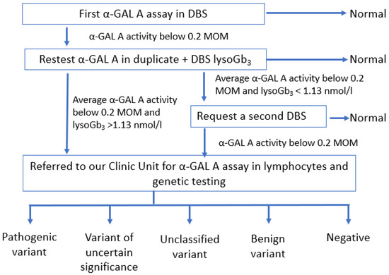 Our study on NBS for FD shows some limitations. Regarding the role of the biomarker lyso-Gb3 as a second-tier test in NBS for FD, our experience confirms, as previously reported [70,71], that it is not reliable and cannot be used to reduce the recall rate. However, lyso-Gb3, when elevated in DBS, makes the application of the diagnostic algorithm easier (Figure 2). During follow-up, plasma lyso-Gb3 is very useful for the biochemical monitoring of patients.