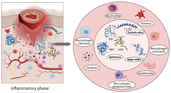 The role of the immune cells in the inflammatory phase is intended to eliminate intracellular pathogens, and this is achieved by producing host defence peptides, which in turn promote the robust recruitment of immune cells such as neutrophils, monocytes/macrophages, dendritic cells, and T cells [26]. Altered levels of either pro- [102,103] or anti-inflammatory [81,104,105] cytokines have been reported in inflammatory conditions. A persistent inflammatory environment has been demonstrated to affect not only the function of immune cells [106], but also the composition of the host defence peptides detected at the wound site [107] (Figure 3).