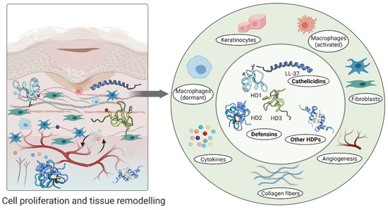 Factors affecting wound healing can be categorised into systemic and local factors. Systemic factors are present at all times in the individual, as seen in diseases such as diabetes, stress, obesity and age, while local factors include factors, such as infection, oxygenation and foreign bodies, which directly influence the wound locally [78]. The local factors lead to high levels of pro-inflammatory cytokines and ROS, impaired cell and protease function and a lack of growth factors [79]. HDPs have been demonstrated to influence many local factors, such as regulating expression of cytokines [80], chemokines [81], proteases [82], growth factors [83] and immune cell activity [84,85,86] (Table 1).