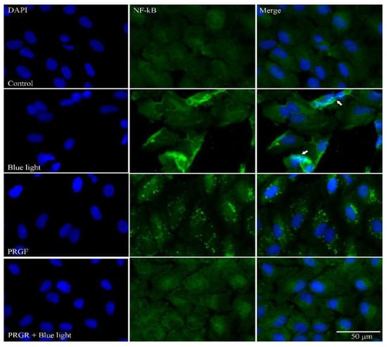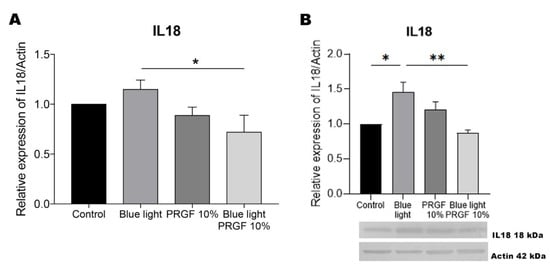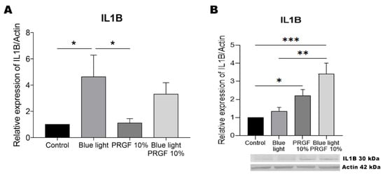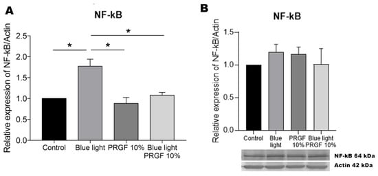 | Blue light + PRGF | PRGF 10% + DMEM F12 + FBS 1% | Dark 1 h + blue light 18 h |