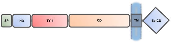 EpCAM is a unique cell adhesion molecule (CAM) that does not resemble other classical adhesion molecules (e.g., cadherins, selectins, integrins, and immunoglobulin-like-CAMs) in either structure or function. EpCAM’s protein structure (Figure 1) is highly conserved across different species, especially in higher vertebrates including humans [1]. EpCAM consists of a large extracellular component (242 amino acids) with a smaller single-pass transmembrane (23 amino acids) and an intracellular (26 amino acids) structure. EpCAM has 314 amino acids and six described domains: signal peptide (SP), N-terminal domain (ND), type-1 thyroglobulin domain (TY-1), carboxyl-terminal domain (CD), transmembrane domain (TM), and intracellular domain (EpICD). Recent structural studies demonstrate that EpCAM’s extracellular tertiary structure assumes a heart, or triangle shape and EpCAM frequently forms cis dimers on epithelial cell surfaces [25,26].