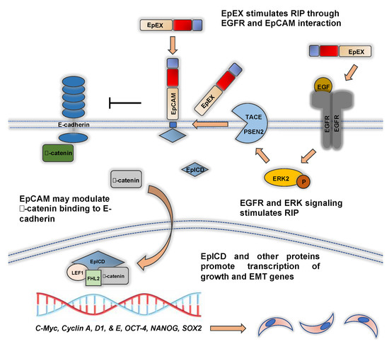 In 2009, it was shown that EpCAM can function as an intracellular signaling molecule and this likely plays an important role in EMT (Figure 3). EpCAM is cleaved at the cellular membrane in a process called regulated intramembrane proteolysis (RIP) by tumor necrosis factor-α-converting enzyme (TACE, also known as ADAM metallopeptidase 17 [ADAM17]) and presenilin 2 (PSEN2), which is part of the γ-secretase complex. This cleavage is stimulated by soluble EpEX binding of EpCAM, cell–cell contact, and EGFR signaling [12,55,56]. The role of EGFR signaling is discussed in further detail below. EpCAM cleavage releases the intracellular domain of EpCAM (EpICD) into the cytoplasm where it is transported into the nucleus. Nuclear EpICD binds Four-and-a-half LIM Domains 2 (FHL2), Lymphoid Enhancer Binder Factor 1 (LEF1), and β-catenin to form a DNA binding complex that stimulates the transcription of target genes. This in turn promotes tumor growth and EMT [12,44,55,56,57,58]. Upregulated nuclear β-catenin signaling is a major driver in many cancers and promotes EMT [48]. These findings suggest that RIP of EpCAM, which would presumably relieve its adhesive function, also likely promotes EMT. A recent study demonstrated that RIP and EpICD generation occurs rather slowly compared to other signaling mechanisms. The authors of this study concluded that EpICD generation by RIP is responsible for steady signaling events, as opposed to rapid transmission of extracellular cues into de novo gene transcription [59]. This would suggest that EpICD signaling may not be an initiating or driver event in EMT, but rather may play a supporting role.