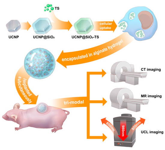 In the last decade, upconversion nanoparticles (UCNPs) have attracted increased attention as molecular imaging probes for their unique optical properties and biocompatibility [9]. UCNPs are compounds that primarily comprise lanthanide elements from rare earth materials, and they can emit visible and near-infrared (NIR) (650–900 nm) light when evoked by light with a wavelength of 980 nm, which is known as upconversion luminescence (UCL). UCL has a significantly higher photostability, sensitivity, and tissue permeability, and lower autofluorescence and photodamage than the traditional “downconversion” fluorophores, such as GFP and luciferase [10]; additionally, UCNPs themselves have a considerably lower cytotoxicity. More importantly, owing to the paramagnetic capability of gadolinium and high X-ray absorption coefficients of ytterbium, UCNPs doped with Gd and Yb can work as both X-ray computed tomography (CT) and magnetic resonance imaging (MRI) contrast agents, thereby enabling tri-modal in vivo imaging [11,12,13,14].