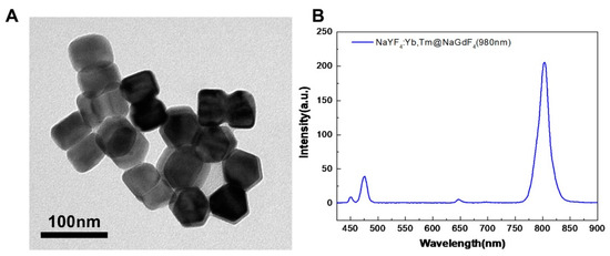 Characterizations of UCNP@SiO2-TS (NaYF4:Yb3+/Tm3+@ NaGdF4 @ SiO2-NH2). (A) The high-resolution TEM image exhibits a regular hexagonal shape of the particles. (B) Luminescence spectrum of UCNP@SiO2-TS under 980 nm laser-light excitation. Two peaks can be observed at approximately 470 and 800 nm.