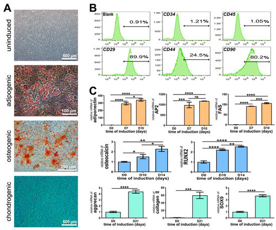 Identification of rat CSPCs. (A) Multilineage differentiation of the isolated CSPCs. On the 7th day of adipocytic differentiation, lipid-rich vacuoles stained with Oil red O are observed within the cytoplasm. On the 10th day of osteogenic differentiation, calcium nodules that are positive for Alizarin Red are formed. On the 21st day of chondrogenic differentiation, the CSPCs are all positive for Alcian blue. (B) Flow cytometry analysis of the expression of cell-surface markers. The surface markers that are specifically positive for mesenchyme cells (CD29, CD44, and CD90) are all highly expressed, whereas CD34 and CD45 are negatively expressed. (C) The RT-PCR results show a significant increase in mRNA expression of adipogenic markers (adiponectin, AP2, and FAS), osteogenic markers (osteocalcin and RUNX2), and chondrogenic markers (aggrecan, collagen II, and SOX-9) after multilineage-induced differentiation (* p < 0.05, ** p < 0.01, *** p < 0.001, **** p < 0.0001, ns p > 0.05).