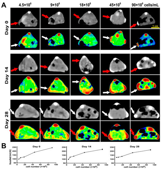In vivo CT imaging of hydrogel constructs containing UCNP@SiO2-TS-labeled CSPCs of increasing numbers (4.5–90 × 106 cells/mL). (A) In vivo transverse CT images of the implanted constructs (indicated by red arrows in greyscale and white arrows in pseudo-color) on days 0, 14, and 28 post-implantation. (B) Corresponding CT values of the regions of interest (denoted by yellow circles in A).