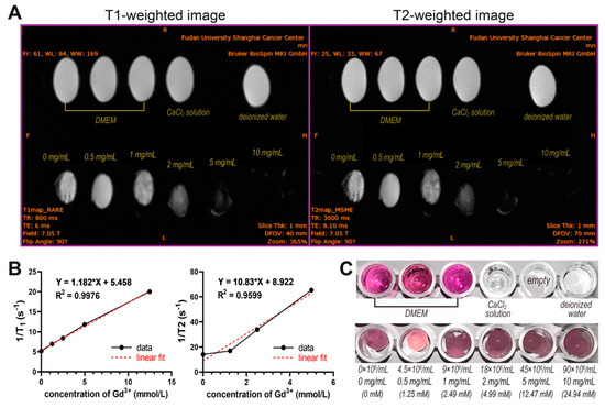Figure 8A displays the representative T1-weighted (TR = 800 ms, TE = 6 ms) and T2-weighted (TR = 3000 ms, TE = 8.1 ms) MR phantom images of UCNP@SiO2-TS-labeled CSPCs of various concentrations. It is noteworthy that the signal intensities in all the T1-weighted images tended to decline with Gd3+ concentration, and the signals were minimal when the nanoparticle concentrations exceeded 5 mg/mL (which corresponds to a 4.99 mol/L Gd3+ concentration), which was inconsistent with the widely evaluated positive MRI contrast capabilities of gadolinium [16,32,33,34]. A similar signal intensity attenuation was also observed at a manganese concentration of 1.5 mM in a previous study [35]. It is worth noting that the Gd3+ concentrations examined in this study were no lower than 1.25 mmol/L (mM), whereas the Gd3+ concentrations tested for MRI in most studies were significantly lower. According to the linear fitting curves, the longitudinal relaxivity (r1) and transverse relaxivity (r2) were measured at 1.182 and 10.83 mM−1S−1, respectively (Figure 8B), which were lower than those calculated in previous studies that applied the same type of UCNPs [11,14,15,17,36].