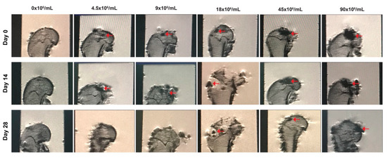 In vivo MRI imaging of hydrogel constructs containing UCNP@SiO2-TS-labeled CSPCs of increasing numbers (4.5–90 × 106 cells/mL) in cartilage-defect model. MRI of the injected constructs (indicated by red arrows) on days 0, 14, and 28.