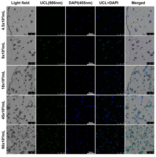 The cell–hydrogel constructs containing different concentrations (4.5–90 × 106 cells/mL) of UCNP@SiO2-TS-labeled CSPCs were fixed with 4% paraformaldehyde, sectioned into slides, stained with DAPI, and visualized and photographed under a confocal microscope, similar to the method described in Section 2.3.1.