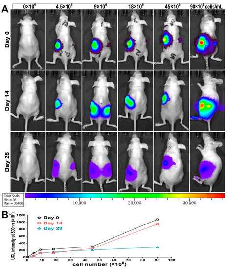 Long-term tracking and quantification of CSPCs engrafted with UCL was also performed on days 0, 14, and 28 post-implantation. As displayed in Figure 11A, the intensity of the UCL collected at 800 nm increased with the number of gradient cells. Although the luminescence gradually attenuated over time, the signals remained explicit on day 28, even in the group with the lowest cell number. Proportional results were consistently obtained from the plots of the quantified UCL signal intensity versus the tracked cell numbers. Among the groups with cell numbers ranging from 4.5 to 45 × 106 cells/mL, no significant difference was observed between days 14 and 28, and both were slightly lower than that on day 0. However, the intensity of the group of 90 × 106 cells/mL on day 28 was remarkably reduced, which we consider to be a result of the expansion of the labeled cells.
