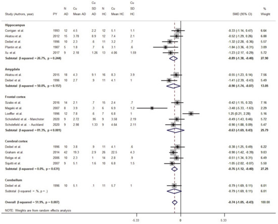 In a meta-analysis of Cu in the brain, subgroup analysis was performed stratified for the hippocampus, amygdala, a not well defined ‘cerebral cortex’ area, and frontal cortex.