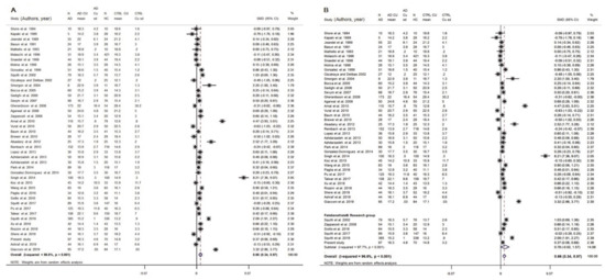 Overall, we extracted the number of participants in each group of each selected study, characteristics of participants (age and sex), and type of study. Concerning the parameters of interest, we extracted means and standard deviations (SD) related to the AD and HC groups. When this information was not available, we tried to extract medians and intervals (range or interquartile range) and insert them into the tables.