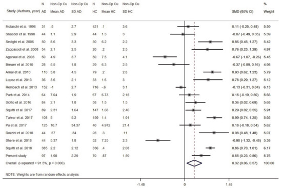 The meta-analysis investigating differences in Cu and Non-Cp Cu levels in serum/plasma indicate increased levels of Cu and reveal a high degree of heterogeneity.