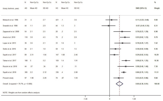 The results on plasma samples showed no significant difference (SMD = 1.11; 95% CI−0.06, 2.27; p = 0.062) and a high heterogeneity (I2 = 98.2%; p < 0.001). In fact, three studies reported no significant results [79,80,81]. One study reported higher Cu values in AD patients than in HC [82,83,84,85] and two showed lower Cu values in AD than in HC [86,87].