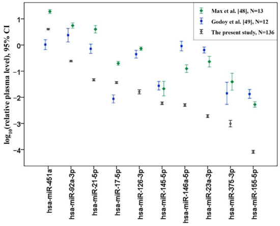 All miRNAs were detectable in plasma by means of the qPCR method with the mean Cq values from 13.9 for the most abundant miR-451a to 29.6 for the lowly-expressed miR-155-5p. To evaluate the consistency of our data with the present plasma whole miRNA profile studies, we compared the relative plasma levels of the target miRNAs with those obtained from the two most recent publications which used plasma small RNA sequencing in cohorts of healthy adults (Max et al. 2018 [48] and Godoy et al. 2018 [49]). These studies contained the miRNA sequencing (miRNA-seq) data obtained from plasma samples of 13 and 12 adults, respectively. For comparison with our qPCR data, relative plasma levels from sequencing data were calculated as normalized read counts of each miRNA related to read counts of miR-16-5p. The results of this comparison are presented in Figure 1. The concordance of the results between two sequencing studies for the analyzed miRNAs was higher than that found between our results and any of these studies. Though the direction of change for most of the miRNAs between each other was similar, our study showed significantly lowered miR-16-5p-normalized relative plasma levels for the majority of miRNAs compared to miRNA-seq data.