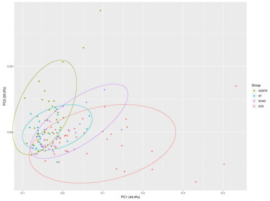 Principal component analysis (PCA) of relative plasma levels of eight miRNAs potentially related to CAD showed the best discrimination (~70 to 80% of cases) between the CONTR and ACS groups (Figure 2). PCA results are presented in Table A2, Appendix A. The HT and SCAD groups shared the majority of cases in PCA plot and were not clearly distinguishable among themselves, as well as between the CONTR and ACS groups.