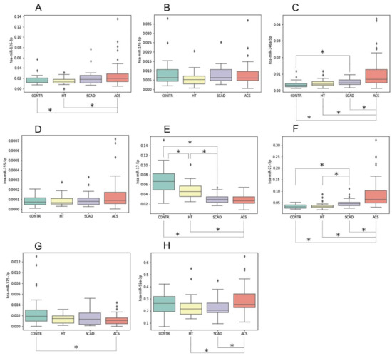 Relative miRNA plasma levels in the study sample groups: ACS, 50 ACS patients; SCAD, 26 patients with stable CAD; HT, 30 hypertensive patients without CAD; CONTR, 30 healthy controls. On the y-axis, relative plasma levels (normalized to miR-16-5p) are shown for miRNAs: miR-126-3p (A); miR-145-5p (B); miR-146a-5p (C); miR-155-5p (D); miR-17-5p (E); miR-21-5p (F); miR-375-3p (G); miR-92a-3p (H). The boxplots represent median and interquartile ranges (IQRs) in the box, minimum and maximum values in the “whiskers”, and outliers in the dots. Asterisks indicate differences in relative miRNA plasma level in the group pairwise comparisons (Mann–Whitney test, * p < 0.05).