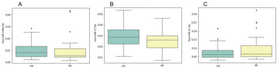 Relative miRNA plasma levels in the study sample groups within the ACS group (n = 50) for miR-146a-5p (A), miR-17-5p (B) and miR-21-5p (C). UA, 26 patients with unstable angina; MI, 24 patients with myocardial infarction (STEMI + NSTEMI). On the y-axis, relative miRNA plasma levels (normalized to miR-16-5p) are shown. The boxplots represent median and interquartile ranges (IQRs) in the box, minimum and maximum values in the “whiskers”, and outliers in the dots.