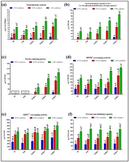 Numerous bioactive compounds have a protective effect against adverse by-products of oxidative metabolism, such as reactive oxygen species (ROS) and other free radicals [42,43]. These reactive species formed during normal physiological reactions in the organisms, are able to exist independently and stimulate oxidative chain reactions that can lead to serious problems at the cellular level [43]. The principle of neutralization of ROS and other free radicals by bioactive compounds is based on three different mechanisms of action: hydrogen atom transfer (HAT), single electron transfer (SET), and the ability to chelate transition metals [42,43,44,45], which are monitored through several antioxidant in vitro screening methods. In the case of complex food matrices, which contain more potential antioxidants, it is desirable to use a combination of several in vitro screening assays, in order to better interpret and understand the examined food system [43,44]. Therefore, in current study five in vitro antioxidant assays, such as TAC, ABTS•+/DPPH• scavenging activity, FRP and FCC, as well as TPC, were used in this study to assess the antioxidant potential of M, TM and TME solutions at three concentration levels (Figure 2).
