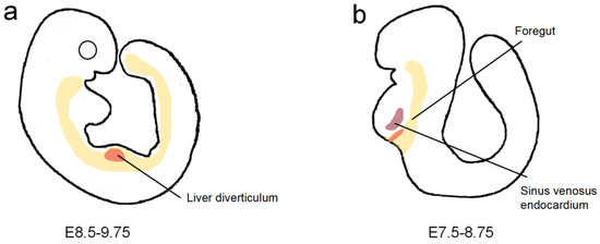The origin of hepatic endothelial cells. (a) At E9.5, the liver diverticulum is surrounded by the omphalomesenteric veins, posterior cardinal veins, or common cardinal veins. (b) At E8.5, the liver at budding stage is located in the portion of the ventral foregut endoderm, which is adjacent to the sinus venosus endocardium.