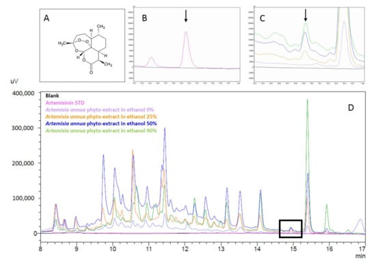 - Bilia, A.R.; de Malgalhaes, P.M.; Bergonzi, M.C.; Vincieri, F.F. Simultaneous analysis of artemisinin and flavonoids of several extracts of Artemisia annua L. obtained from a commercial sample and a selected cultivar. Phytomedicine 2006, 13, 487–493. [Google Scholar] [CrossRef] [PubMed]
