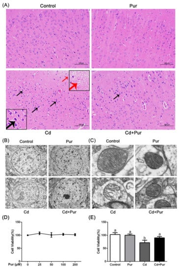 Pur alleviates Cd-induced neuronal injury. Rats were treated with Cd (50 mg/L) and/or Pur (200 mg/kg) for 90 days. (A) H&E staining of the rat cerebral cortices of each group. A period of 90 days of Cd exposure induced the formation of microscopic voids in the cortex (red arrows), neuronal deep staining, unclear boundaries between the cytoplasm and nuclei, as well as gaps around the neurons (black arrows). Treatment with Pur attenuated Cd-induced neuronal injury in the rat cerebral cortices. Scale bars: 100 μm. Representative electron microscopy images show the (B) nuclei and (C) mitochondria in the rat cerebral cortices of each group. Scale bars: (B) 5 μm and (C) 500 nm. (D) Primary cortical neurons were treated with different concentrations of Pur (0 μM–200 μM) for 12 h. Cell viability was detected using a CCK-8 assay. (E) Primary cortical neurons were pretreated with 100 μM Pur for 1 h, followed by exposure to 10 μM Cd for 12 h, after which the cell viability was detected via a CCK-8 assay. Data are expressed as the mean ± SD (n = 4). The means labeled without a common letter (a, b) are significantly different, p < 0.05.