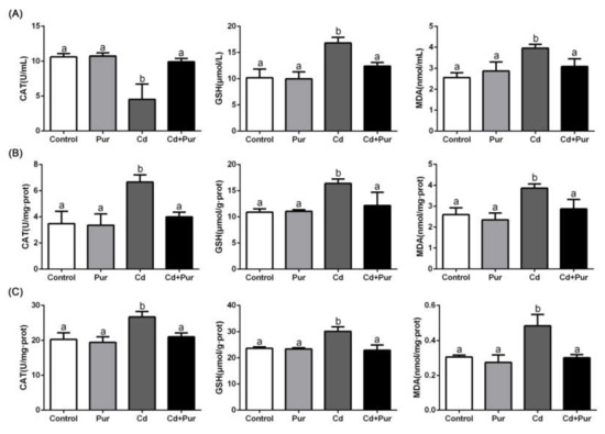 Pur alleviates Cd-induced oxidative stress in the rat serum and cerebral cortical neurons. The rats were treated with Cd (50 mg/L) and/or Pur (200 mg/kg) for 90 days. Primary cortical neurons were pretreated with 100 μM Pur for 1 h, followed by exposure to 10 μM Cd for 12 h. The levels of CAT activity, GSH, and MDA were evaluated in the rat serum (A), cerebral cortex (B), and primary cortical neurons (C). Data are expressed as the mean ± SD (n = 3). The means labeled without a common letter (a, b) are significantly different, p < 0.05.