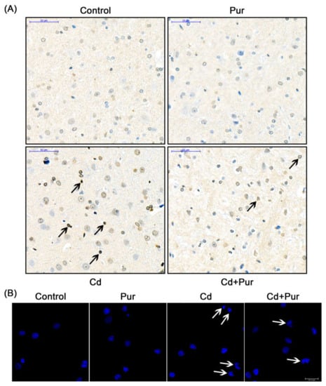 Pur attenuates Cd-induced apoptosis in rat cerebral cortical neurons. (A) Rats were treated with Cd (50 mg/L) and/or Pur (200 mg/kg) for 90 days. Apoptosis in the cerebral cortex was detected by a TUNEL assay. The TUNEL-positive cells were dark red (marked by black arrows). Scale bar: 50 μm. (B) Primary cortical neurons were pretreated with 100 μM Pur for 1 h, followed by 10 μM Cd exposure for 12 h. The morphology of the apoptotic cell nuclei was detected by DAPI staining (arrows point to apoptotic cells). Scale bars: 20 μm.