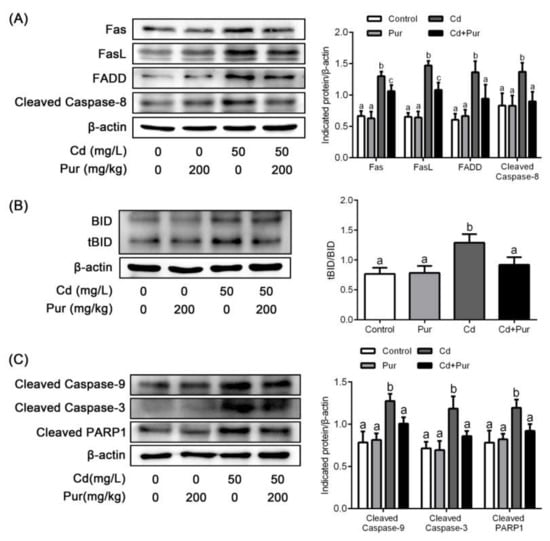 Pur attenuates Cd-induced apoptosis via inhibiting the Fas/FasL-mediated mitochondrial apoptotic pathway in the rat cerebral cortex in vivo. Rats were treated with Cd (50 mg/L) and/or Pur (200 mg/kg) for 90 days. (A) The levels of Fas, FasL, FADD, and Cleaved Caspase-8; (B) ratio of tBID/BID; and (C) the levels of Cleaved Caspase-9, Cleaved Caspase-3, and Cleaved PARP1 were detected by Western blot. Left panel: representative Western blot image; right panel, quantitative analysis (mean ± SD, n = 3). The means labeled without a common letter (a, b, c) are significantly different, p < 0.05.
