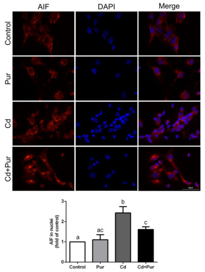 Pur prevents Cd-induced AIF nuclear translocation in the rat cerebral cortex in vivo. Rats were treated with Cd (50 mg/L) and/or Pur (200 mg/kg) for 90 days, after which the cerebral cortices were subjected to AIF immunofluorescence staining. Upper panel: representative immunofluorescence staining images; lower panel: quantitative analysis (mean ± SD; n = 3). The means labeled without a common letter (a, b, c) are significantly different, p < 0.05. Scale. bar: 50 μm.