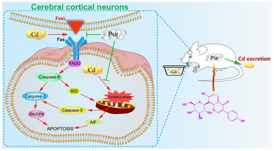 The present study demonstrated for the first time that Pur significantly inhibited the Cd neurotoxicity by stimulating Cd excretion, ameliorating Cd-induced oxidative stress, and apoptosis in rat cerebral cortical neurons (Figure 8). Therefore, Pur may represent a promising novel neuroprotective agent.