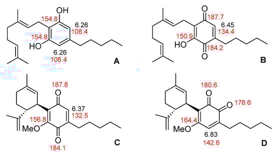 Top: Comparison of selected 1H (black) and 13C (red) NMR resonances of a phytocannabinoid (CBG, A) with those of the corresponding quinone (B). Bottom: Comparison of selected 1H (black) and 13C (red) NMR resonances of O-methyl-p-CBDQ (C) and O-methyl-o-CBDQ (D).