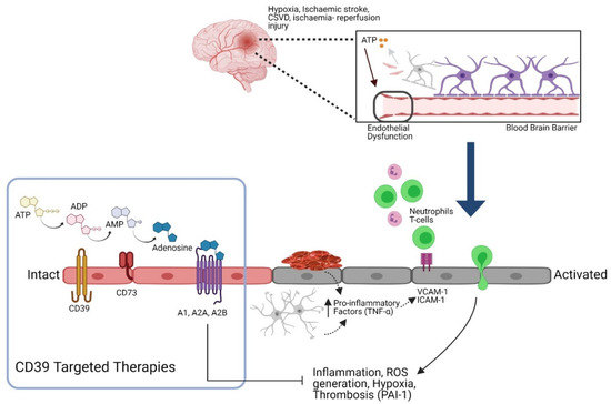 Endothelial dysfunction in the brain is an important underlying pathology of ischemic stroke and cerebral small vessel disease. It promotes oxidative stress, alters erythrocyte deformability, and promotes platelet activation and thrombosis as well as adhesion and transmigration of leukocytes. Adenosine is an endogenous molecule that can attenuate each of these pathological events. Accordingly, CD39 and CD39 therapies, that boost local adenosine levels in the brain, are strong therapeutic candidates to treat endothelial dysfunction underlying cerebrovascular diseases.