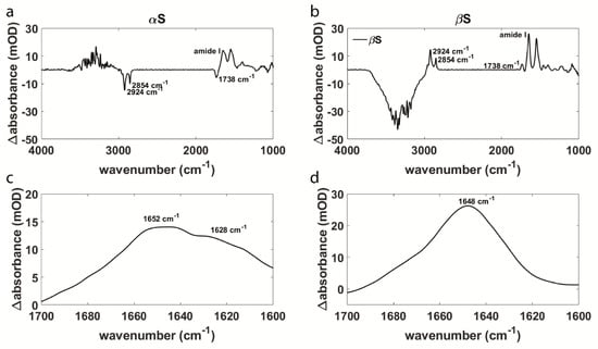 Figure 1. (a,b) Difference spectra of αS and βS after 1 h of interaction with an SSLB (c,d) Magnification of the amide I band showing differences in the secondary structure of αS and βS.