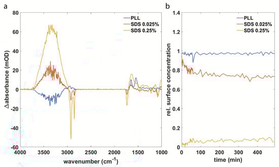 Figure 2. (a) Difference spectra of PLL, 0.025% SDS and 0.25% SDS after 1 h of interaction with an SSLB. (b) The surface concentration of lipids over time upon interaction with the same samples as in (a).