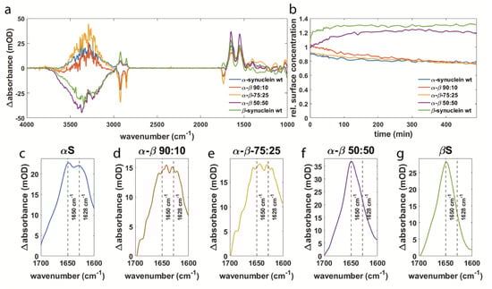 Figure 3. (a) Difference spectra of αS and βS and mixtures of the proteins at ratios of 90:10, 75:25, and 50:50 after 8 h of interaction with an SSLB. (b) Relative surface concentration of the lipids upon interaction with the samples from (a). (cg) Magnification of the amide I band from the spectra in (a) with decreasing αS and increasing βS amounts.