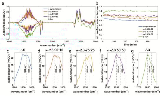 Figure 4. (a) Difference spectra of αS and Δ3 as well as mixtures of both variants at ratios of 90:10, 75:25, and 50:50 after 8 h of interaction with an SSLB. (b) The surface concentration of lipids over time for the same protein variants and corresponding mixtures as in (a). (cg) Magnification of the amide I band from the spectra in (a) with decreasing αS and increasing Δ3 amounts.